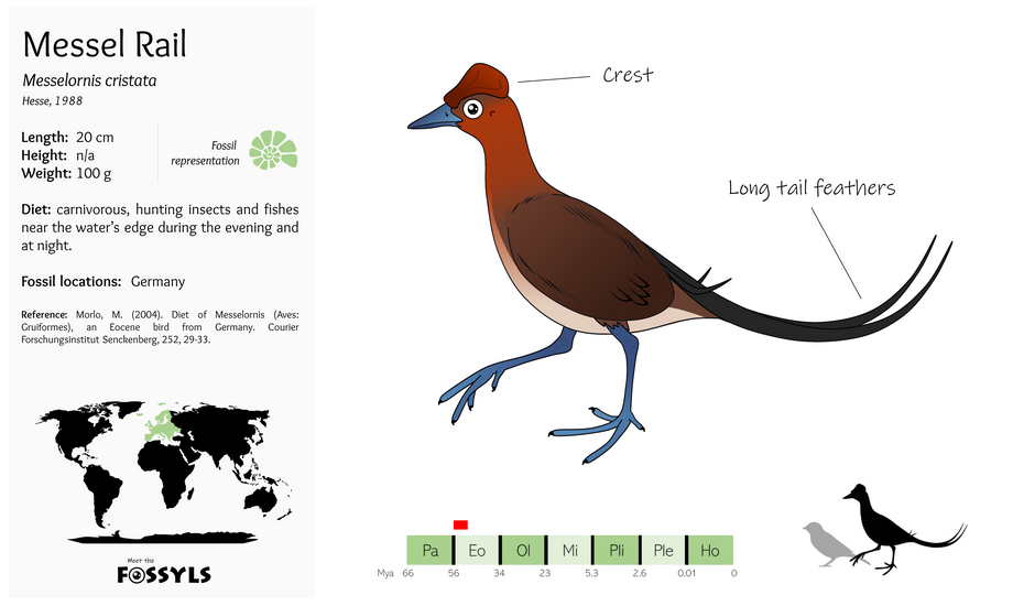 Fossils of the Messel Rails have been found in Europe and North America and some of them, like from Messelornis, have been found in exquisite state! In one of the fossils, a fish has been found within its mouth!